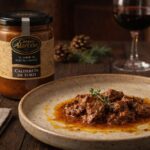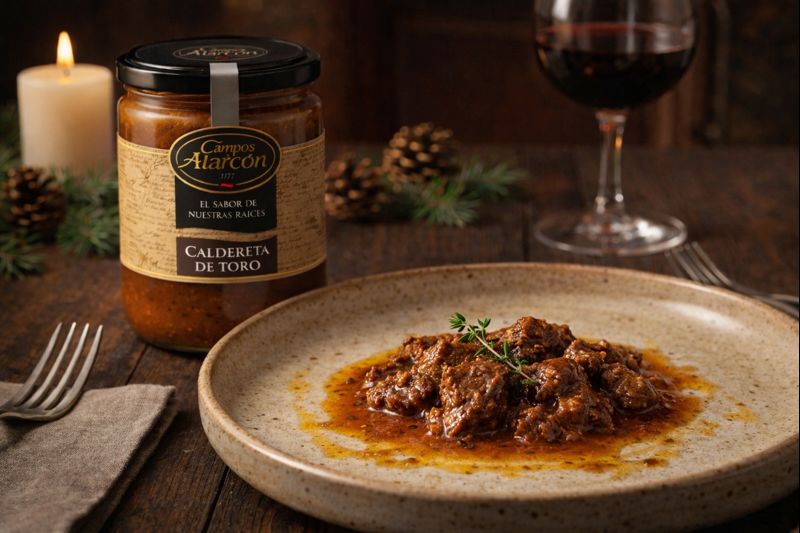 Carne de toro de lidia guisada lentamente en vino tinto con especias, sabor potente, profundo y auténtico de la tierra.